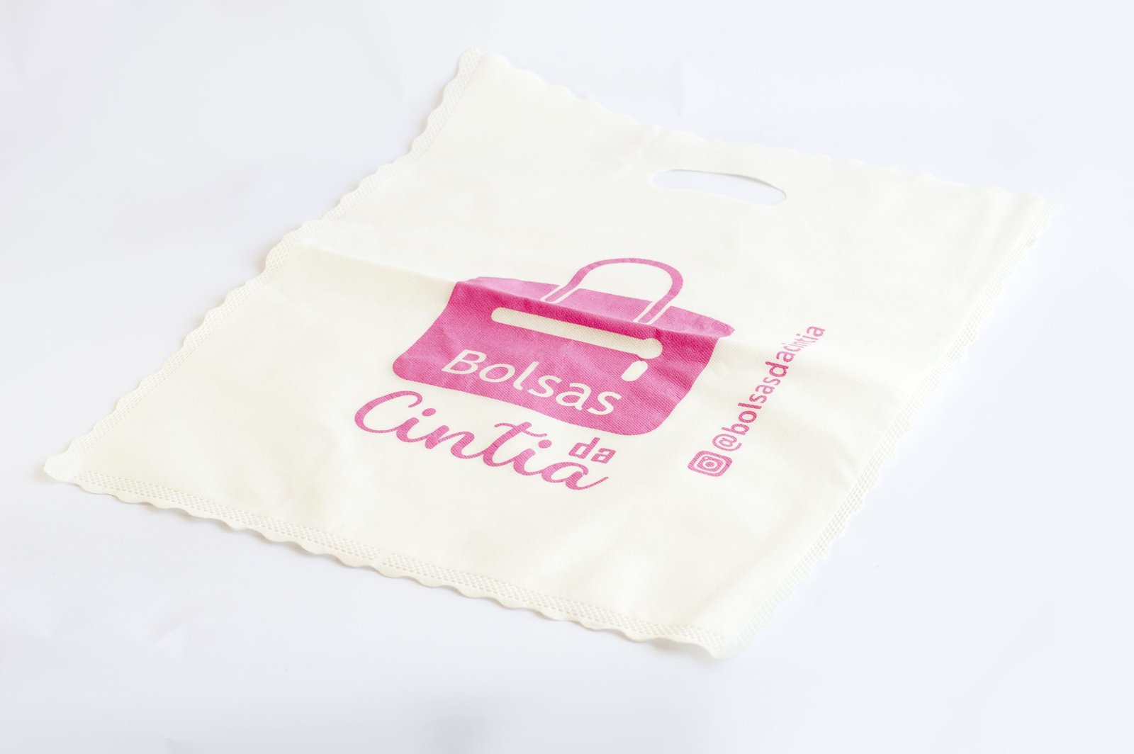 Sacola personalizada com tecido TNT (tecido não tecido), e impressão serigráfica em 1 cor, em 1 lado da sacola.