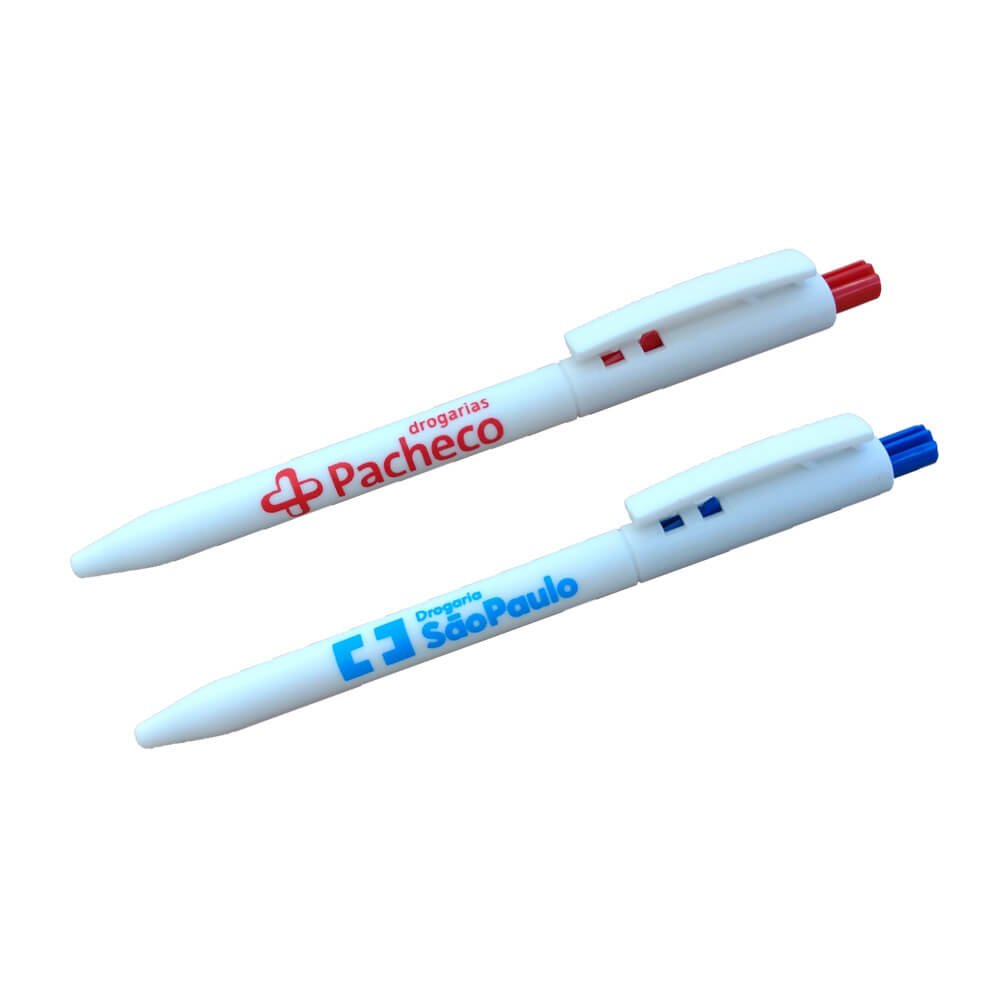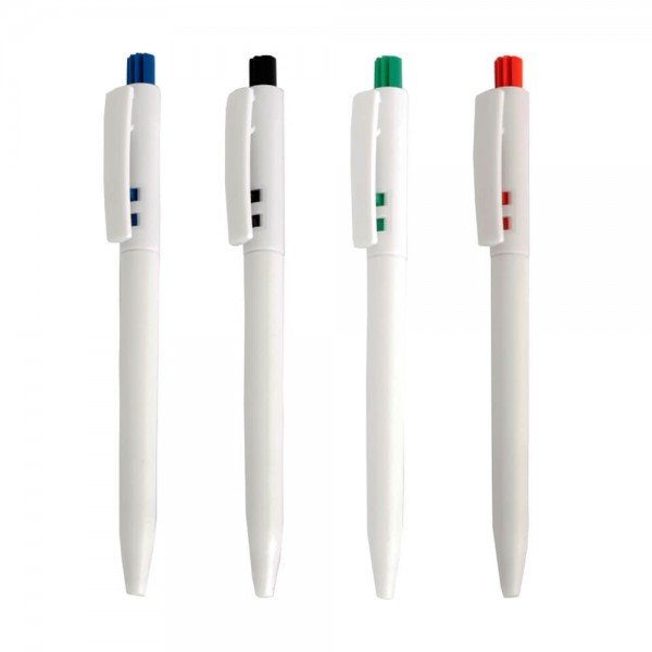 » Caneta plástica personalizada com corpo branco, acionador colorido.