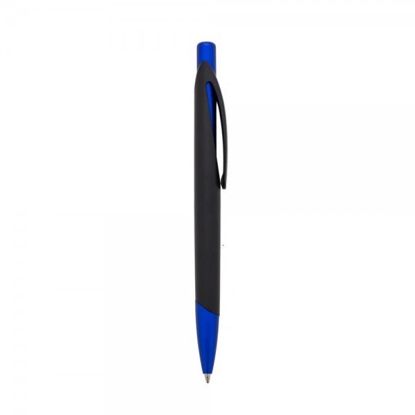 Caneta Personalizada, plástica preto fosco com detalhes coloridos.