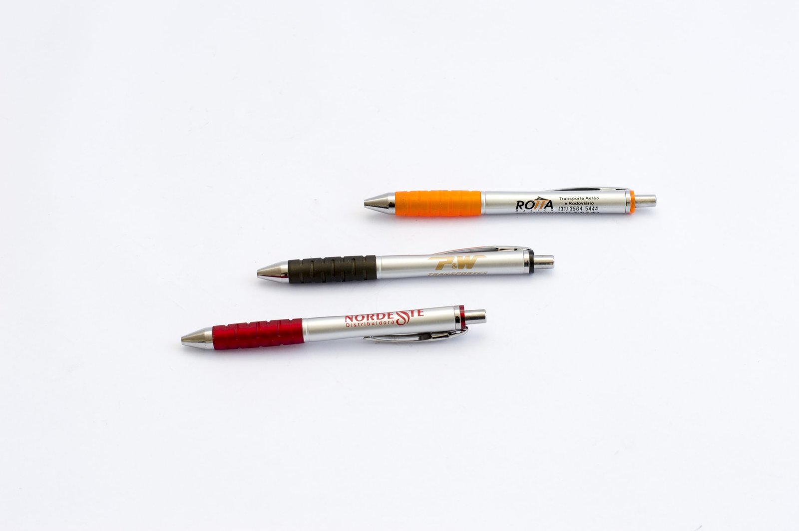 Caneta Personalizada, plástica com clip, acionador e ponteira cromados.