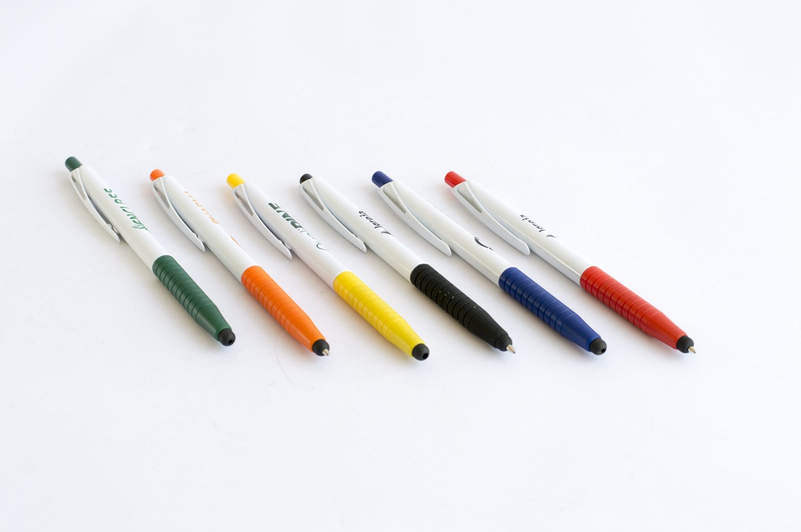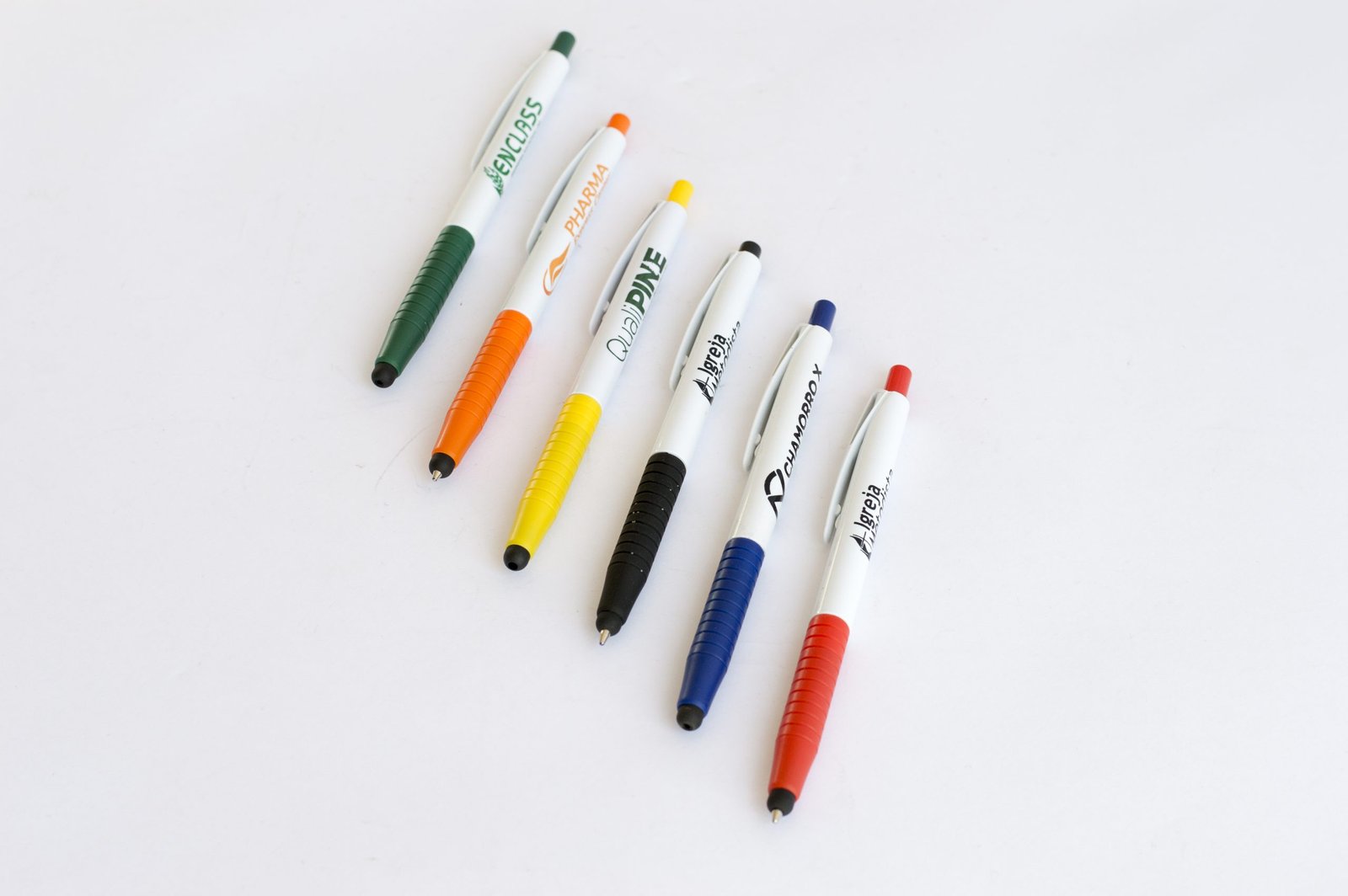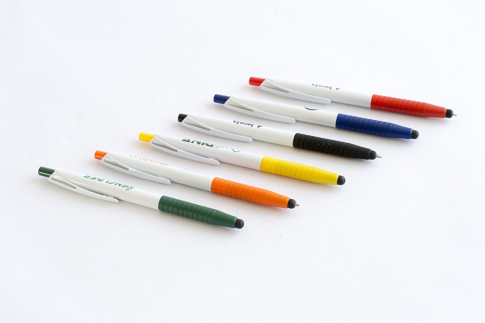 Caneta plástica corpo branco e detalhes coloridos, com ponta touch para usar em telas touch screen.