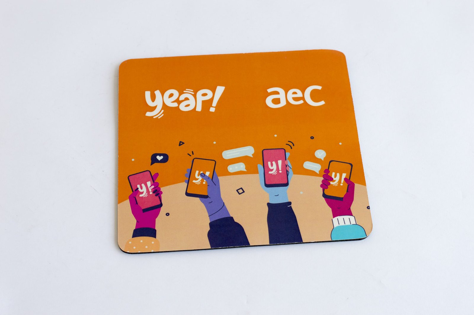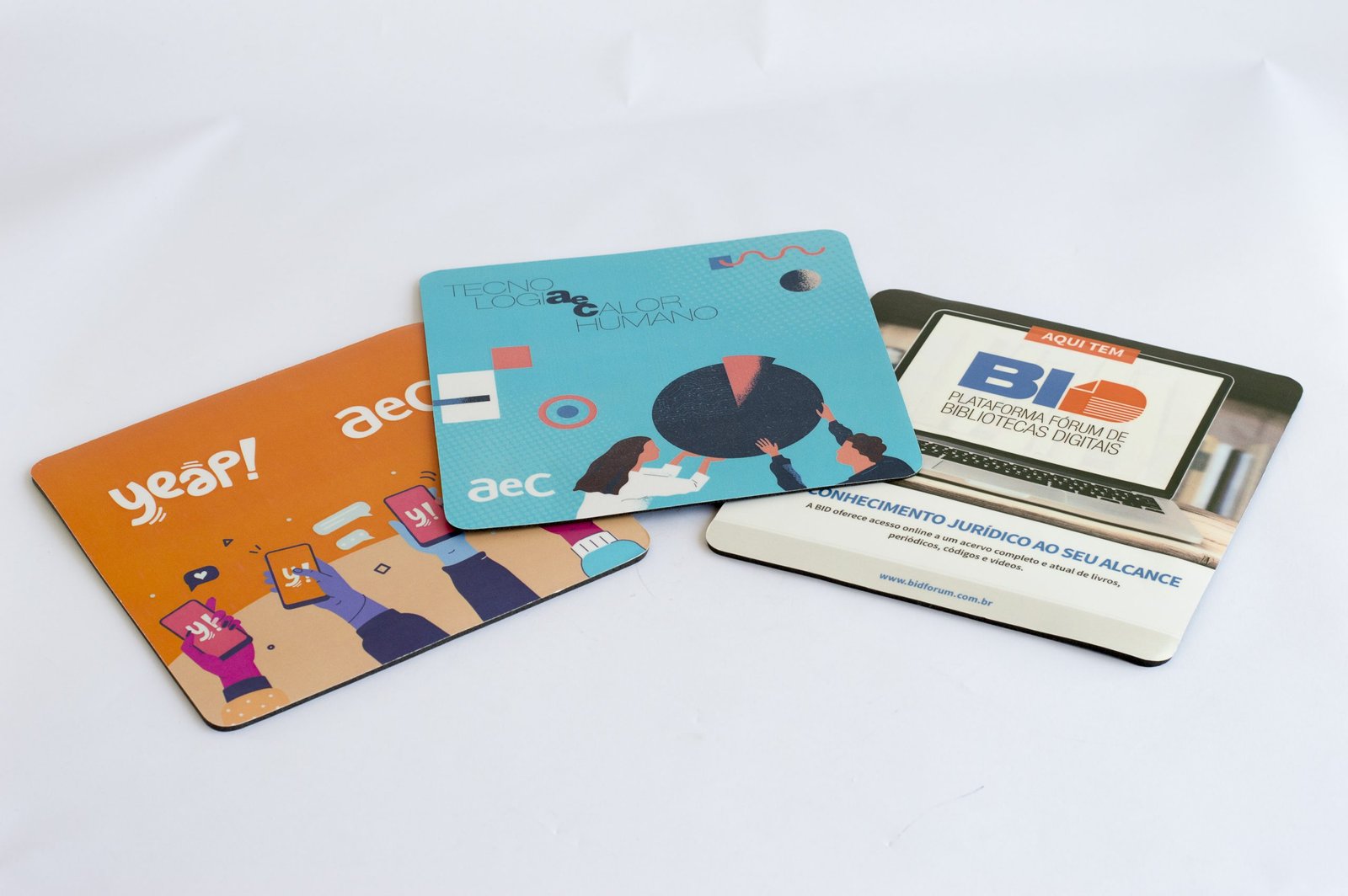 Mouse Pad personalizado quadrado com base de espuma de PVC expandido e revestimento em película texturizada. Podendo usar imagens com fotografias e efeitos em degradê.