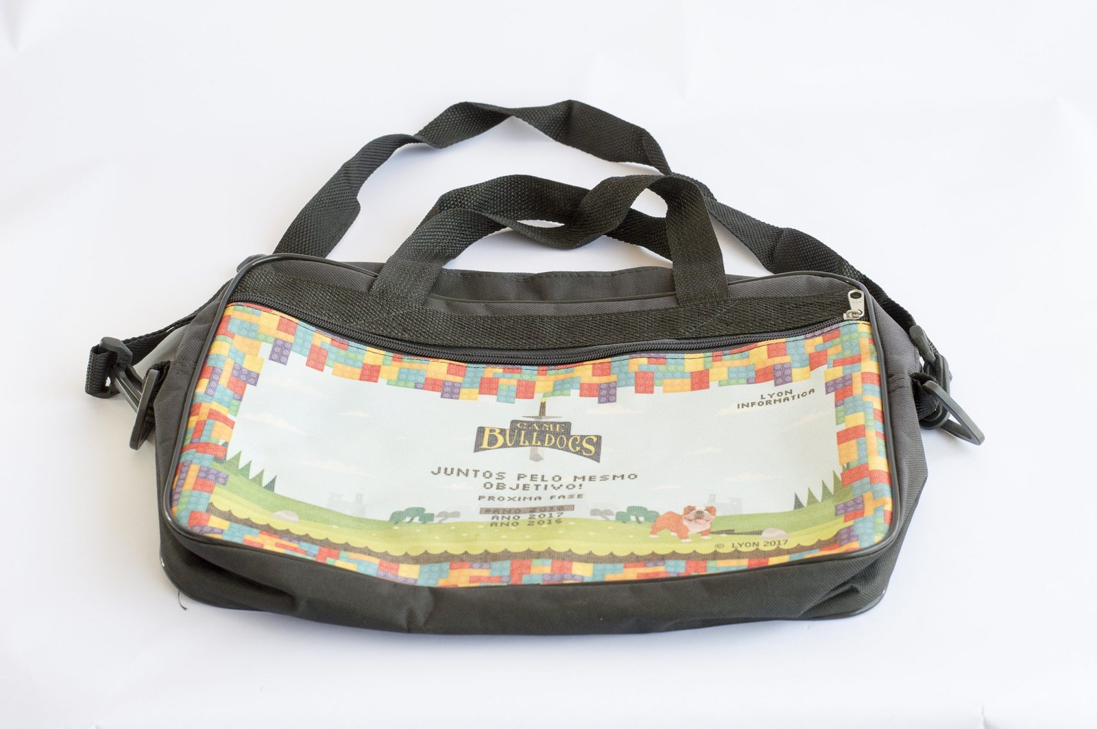 Pasta c/ alça de ombro e mão em lona poliéster ou nylon poliéster, com impressão em lona polipremium e dois zíper.